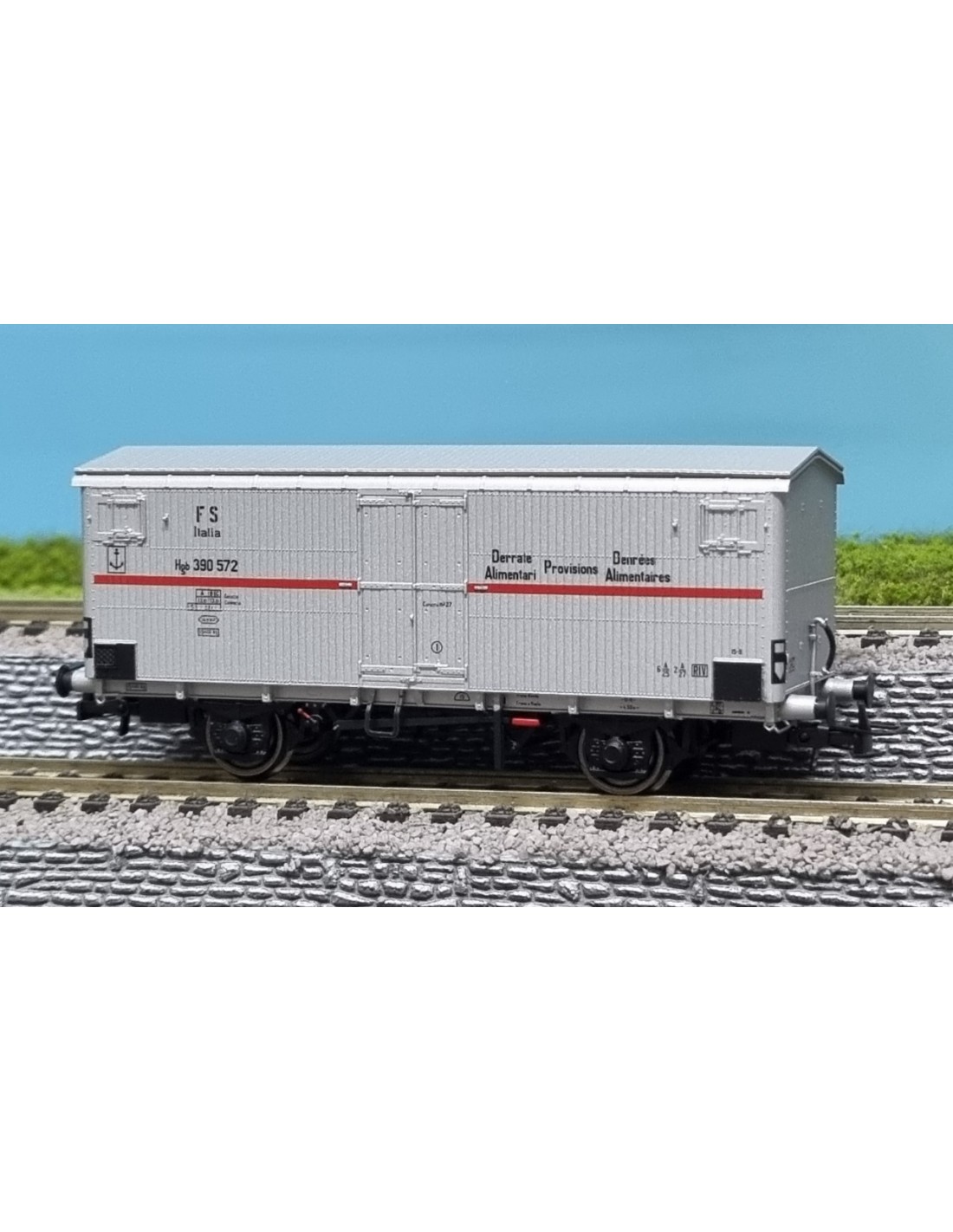 FS, carro refrigerato a 2 assi Hgb 390 572 cassa in legno, sagoma inglese, livrea alluminio con striscia rossa, ep. III