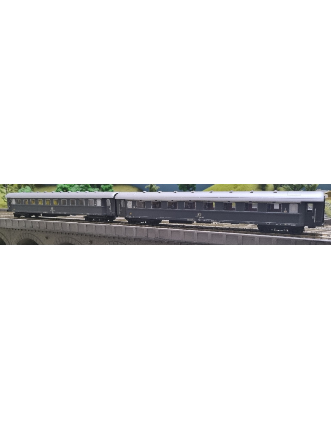 Coppia carrozze FS tipo 1946, una Az 13000 e una Bz33000, livrea grigio ardesia, logo TV, ep. IV