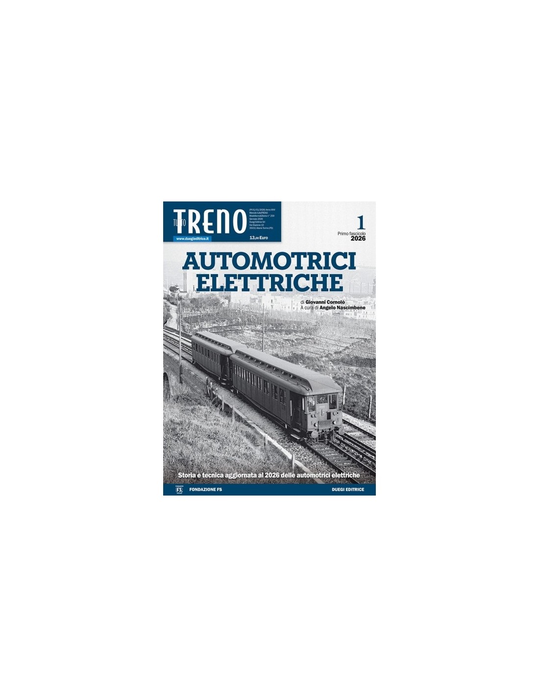 Serie di fascicoli dedicati alle automotrici elettriche, partendo dal libro di Giovanni Cornolò da tempo esaurito. Una raccolta completa, con la storia e la tecnica delle elettromotrici FS aggiornata al 2026, che nel primo fascicolo tratta gli esperimenti condotti a inizio ‘900 con le elettromotrici ad accumulatori delle Reti Mediterranea e Adriatica, per proseguire con quelle a terza rotaia alimentate in corrente continua a 650 Volt dei Gruppi E.10, E.15 ed E.20 e con i piccoli Gruppi E.1 ed E.2 a corrente alternata trifase. Seguono le elettromotrici pesanti E 100 ed E 600 delle Varesine, per chiudere con le E 624 in servizio nel nodo di Napoli. I testi originari, aggiornati con ulteriori notizie riguardanti l’esercizio e le assegnazioni, sono accompagnati da un apparato iconografico in parte rinnovato con fotografie di grande formato.