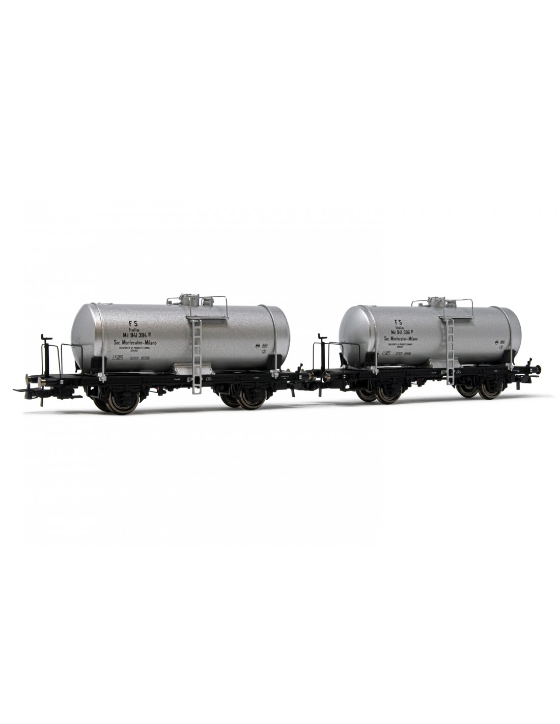 Set composto da 2 carri cisterna a 2 assi delle FS tipo Md, con piattaforma del frenatore, serbatoio da 27 m3, livrea argento Soc. Montecatini - Milano, ep. III