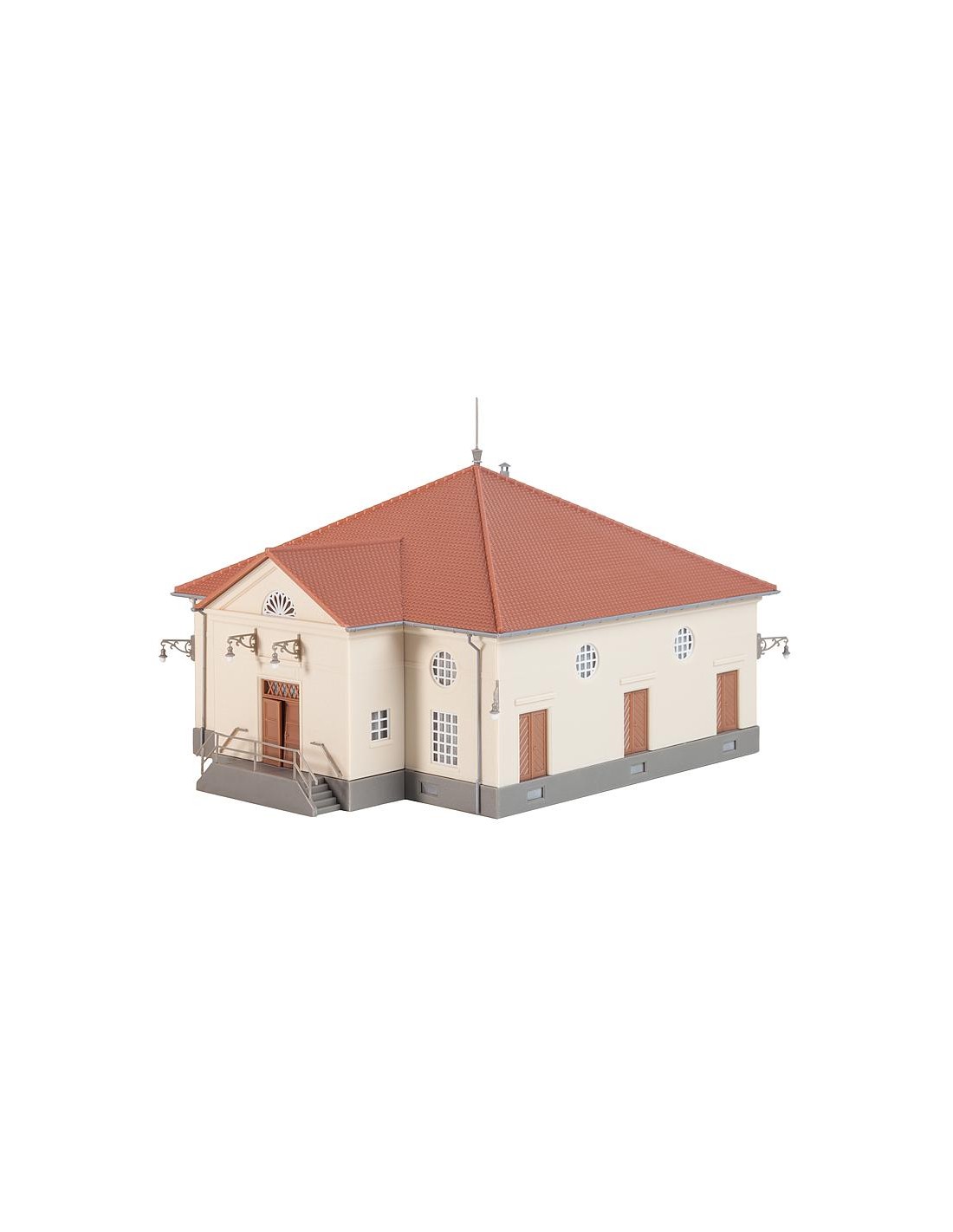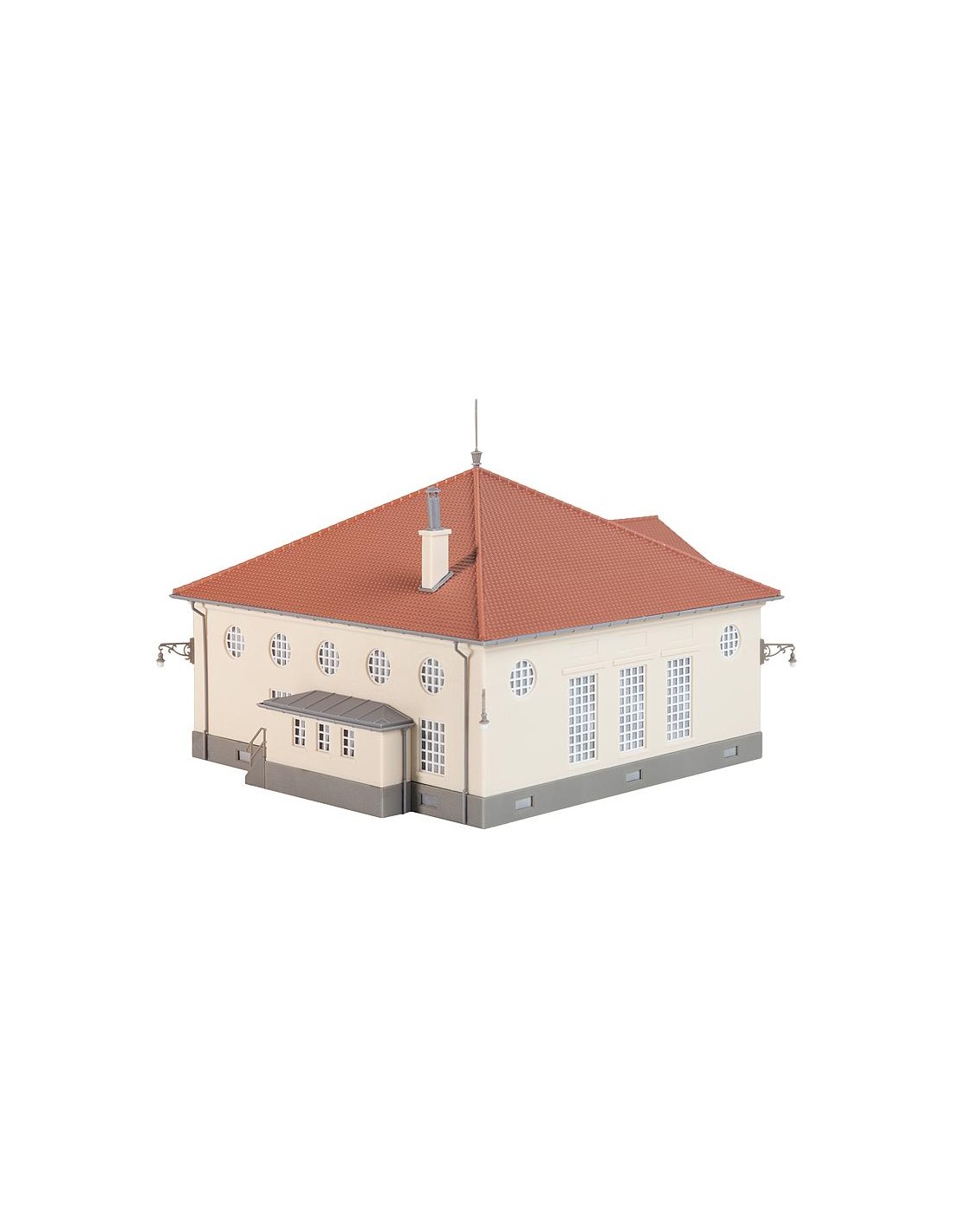 Scatola di montaggio, centrale elettrica! Stazione elettrica con base a muro grigio scuro, facciata leggera intonacata e scala a due rampe per l'approvvigionamento energetico dell'ambiente.