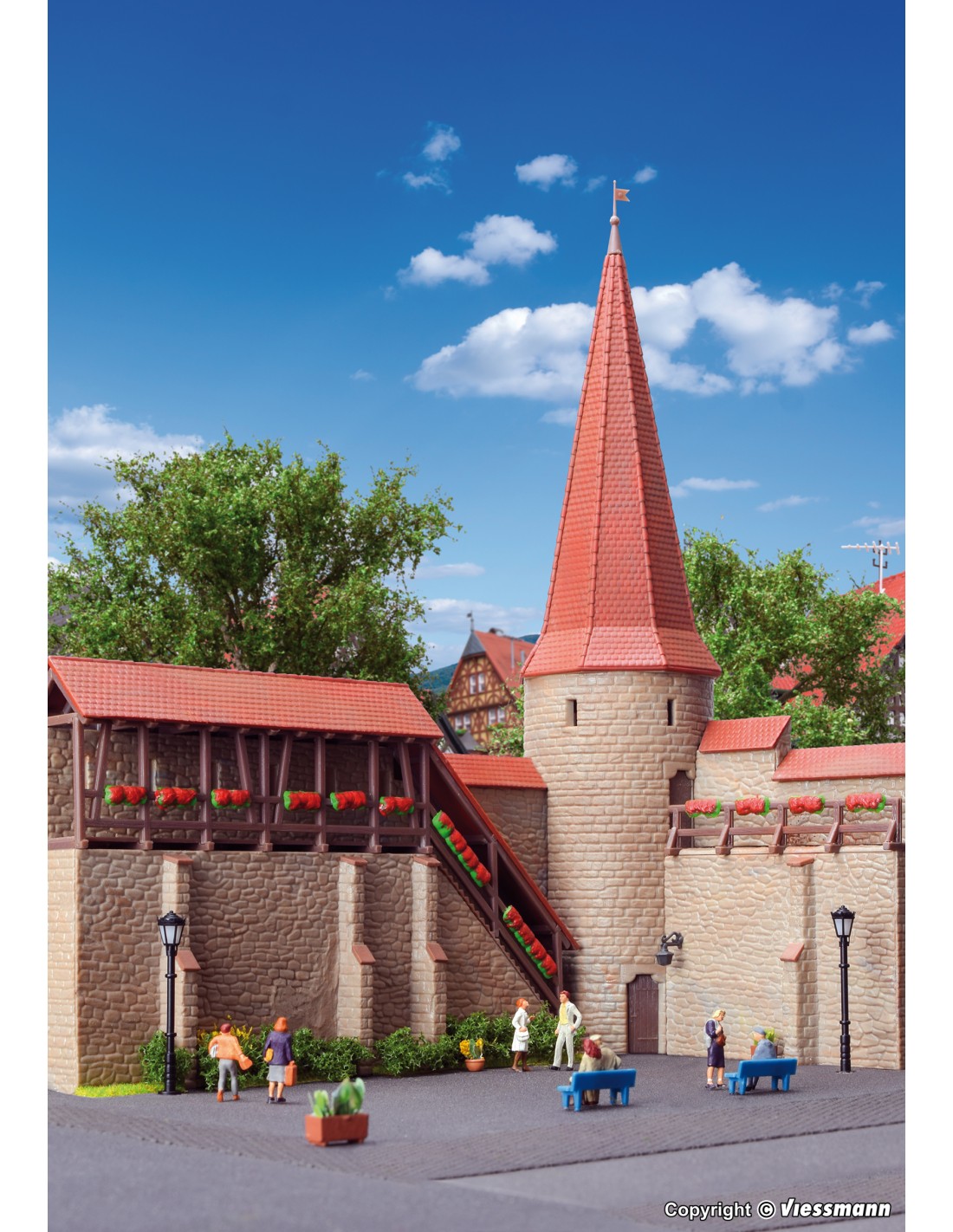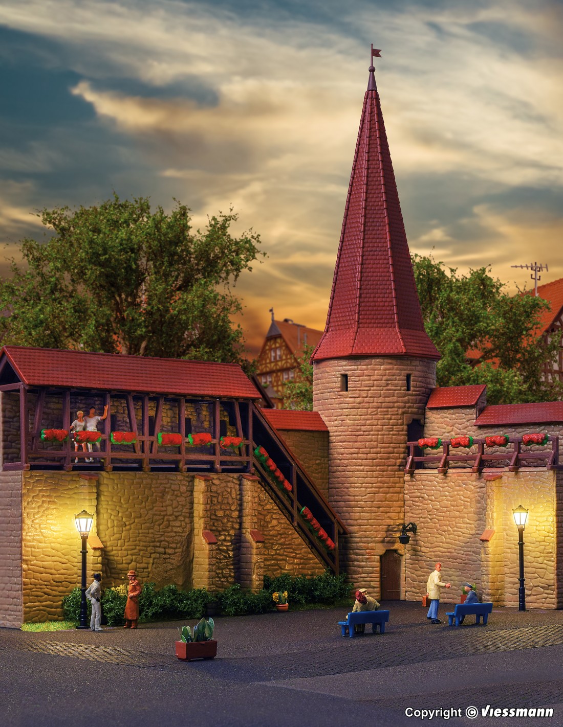Kit in scatola di montaggio. Le mura della città modellano ancora il paesaggio urbano di Weil der Stadt come testimonianza storica e punto di riferimento sorprendente. Oltre alle grandi parti del muro, sono state conservate 4 torri e una porta della città. Nel modello, il muro con la torre rotonda è integrato dal muro con la torre truss Art. 38914 e il muro con giardinetto Art. 38916. Dimensioni: L 24 x P 14 x H 26,5 cm. Livello di difficoltà: 2 (avanzato).