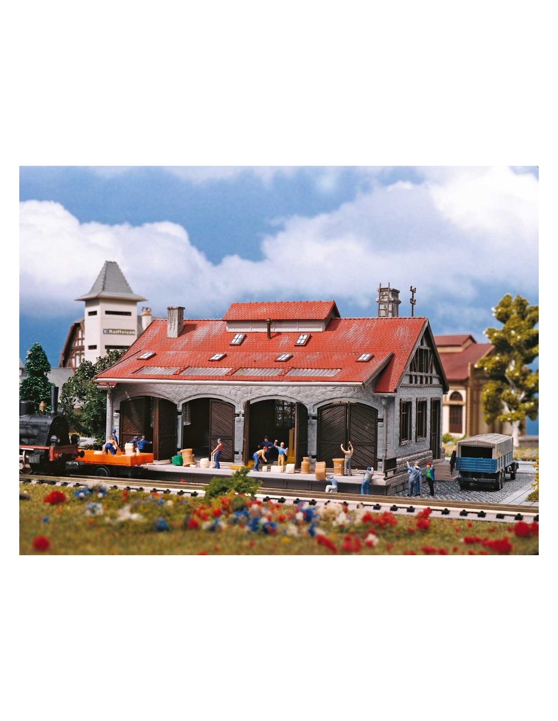 Questo capannone è adatto per lo stoccaggio di merci a pezzi. I camion o i treni possono arrivare direttamente alla rampa di carico. 4 grandi cancelli in legno a doppia anta facilitano lo stoccaggio di merci di grandi dimensioni.