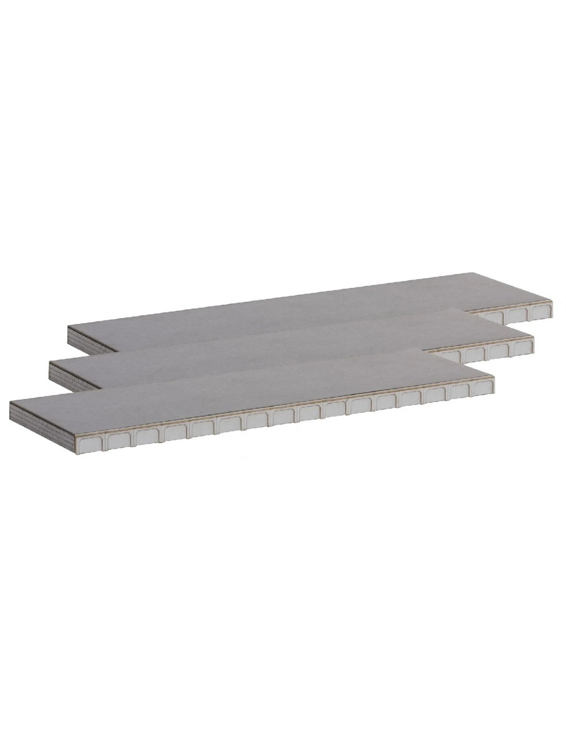 È realizzato in cartone laser speciale che combina due proprietà essenziali: da un lato, è molto stabile, e dall'altro lato, il cartone può essere facilmente modellato con un coltello artigianale o forbici. L'ampia piastra di base fa sì che si possano creare anche piattaforme con raggio di curva. Per poter offrire ai modellisti ferroviari con un sistema di binari più grande nell'area della stazione un pacchetto di rinfuse economico, NOCH ha un nuovo set di 3. Con le tre piattaforme universali incluse, è possibile progettare individualmente piattaforme più lunghe e diversificate.