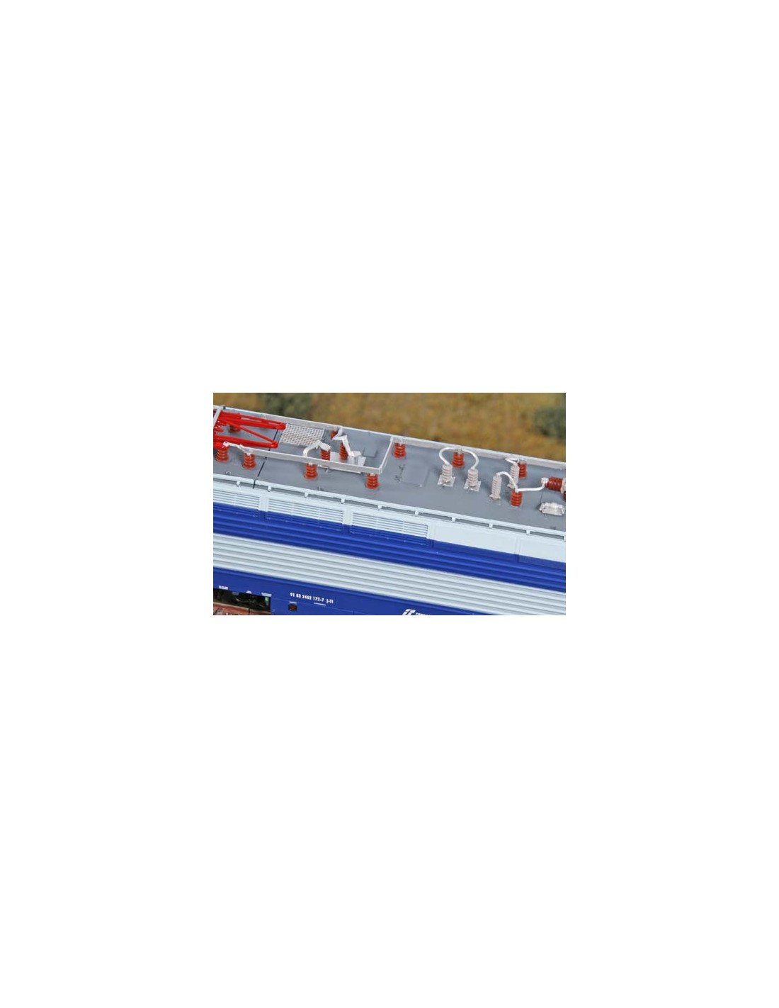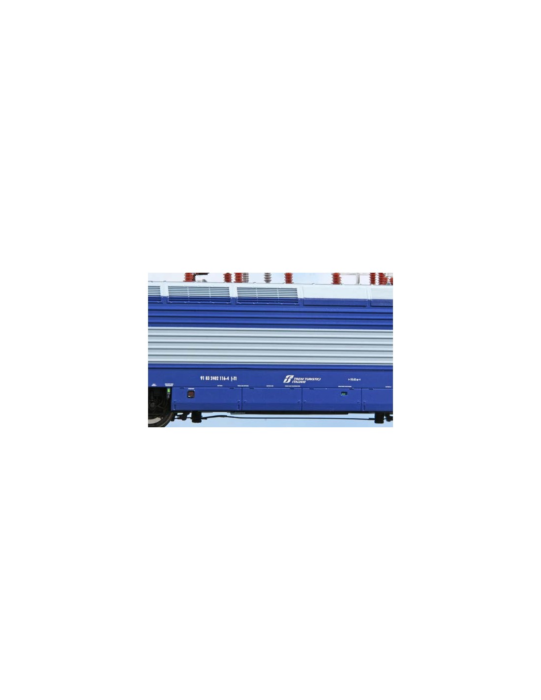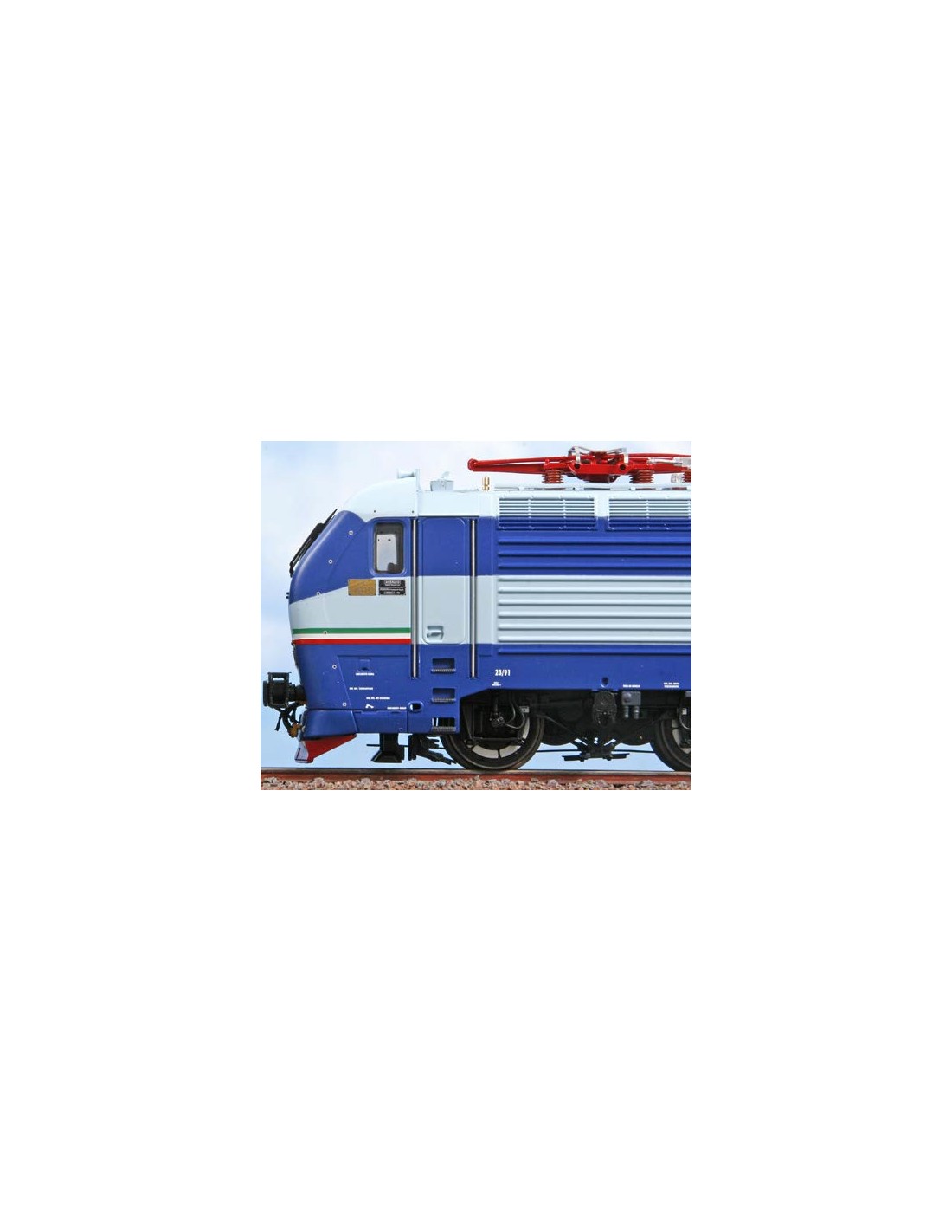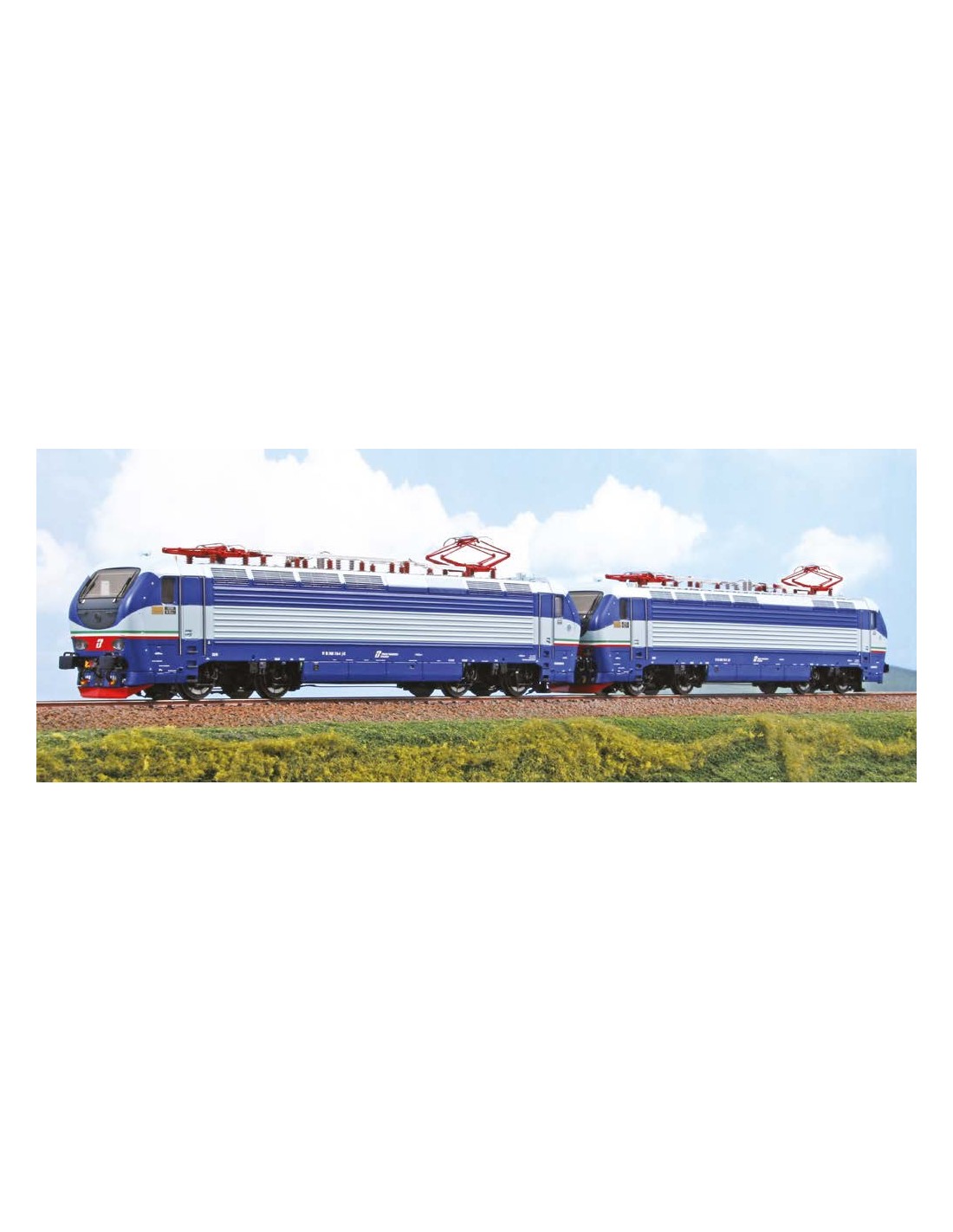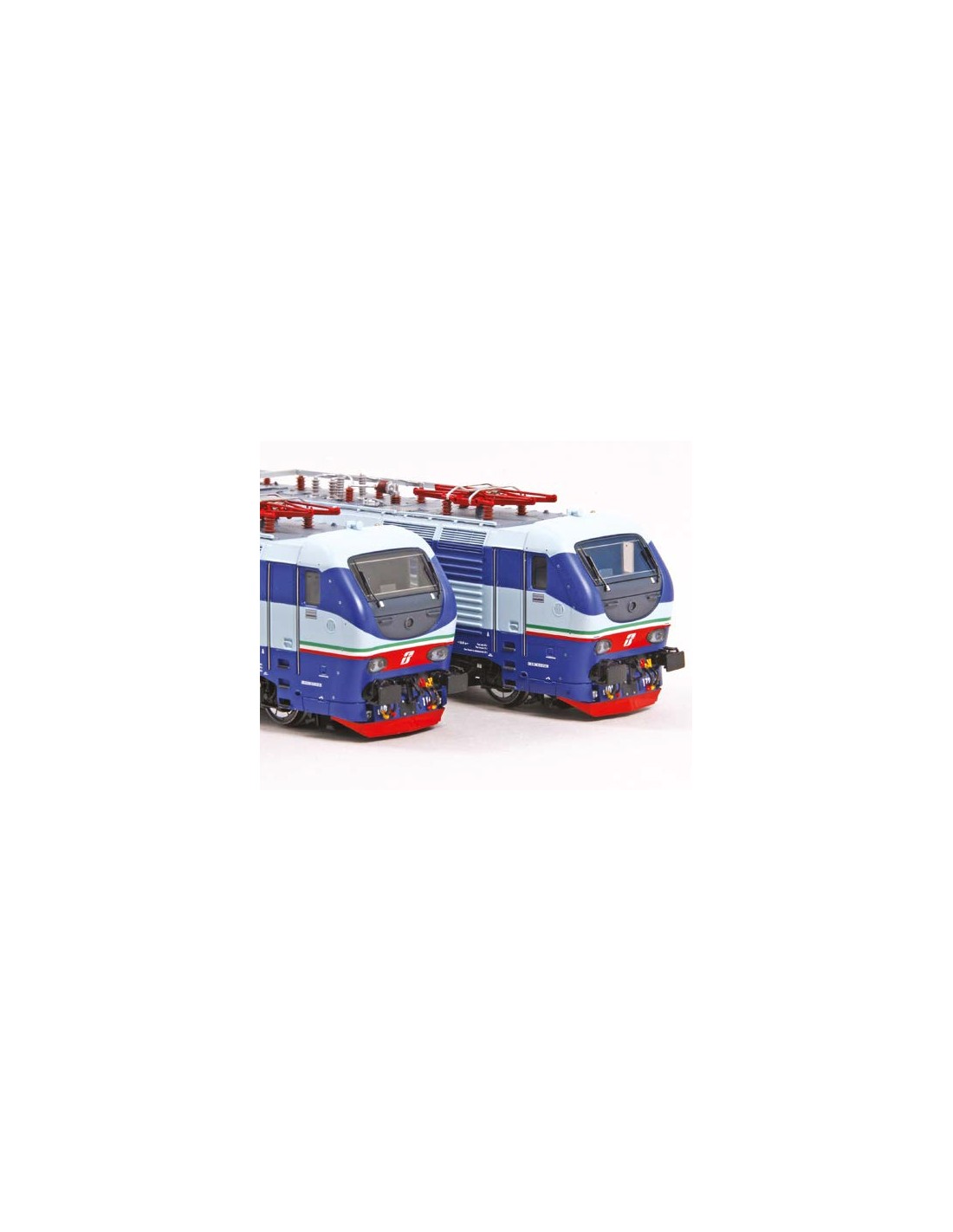 Set aus zwei E-Lok E.402.116 und E.402.172 der Trenitalia in blau/hellblauer Lackierung mit dreifarbigem Band an der Vorderseite. Beide Modelle sind motorisiert und verfügen über Licht.