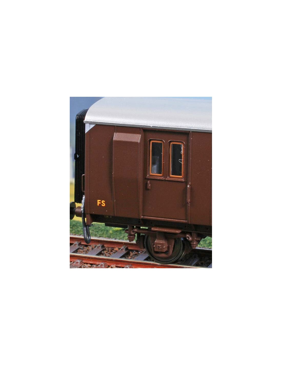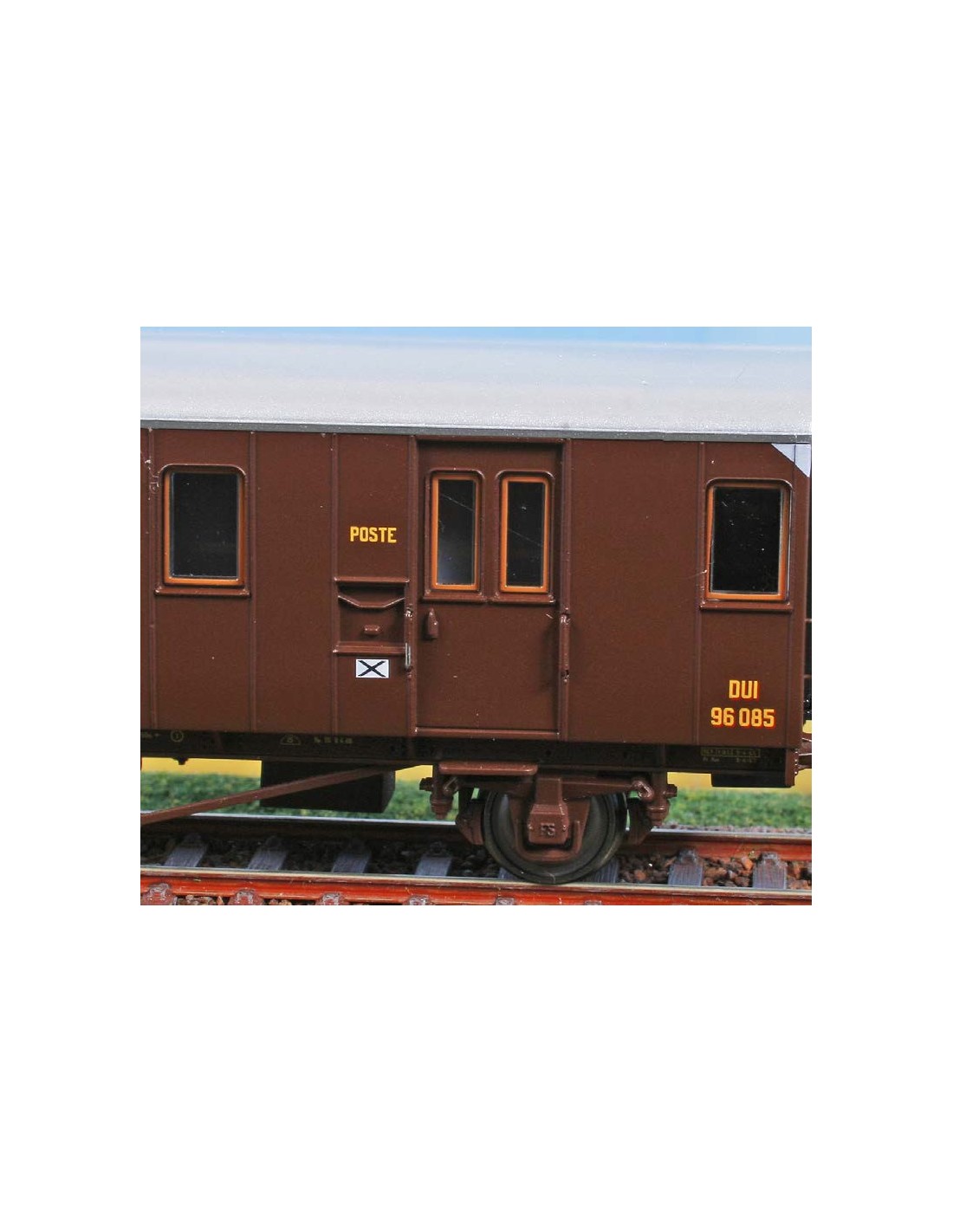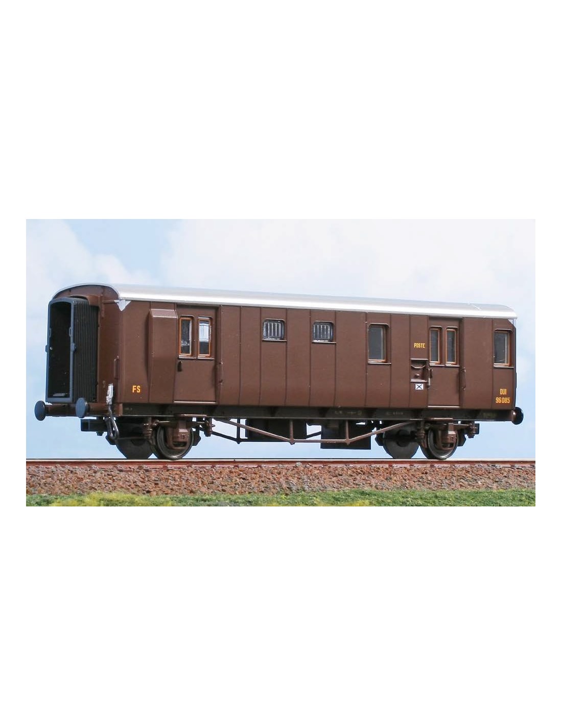 Bagagliaio-posta delle FS DUI 96000 in livrea castano.