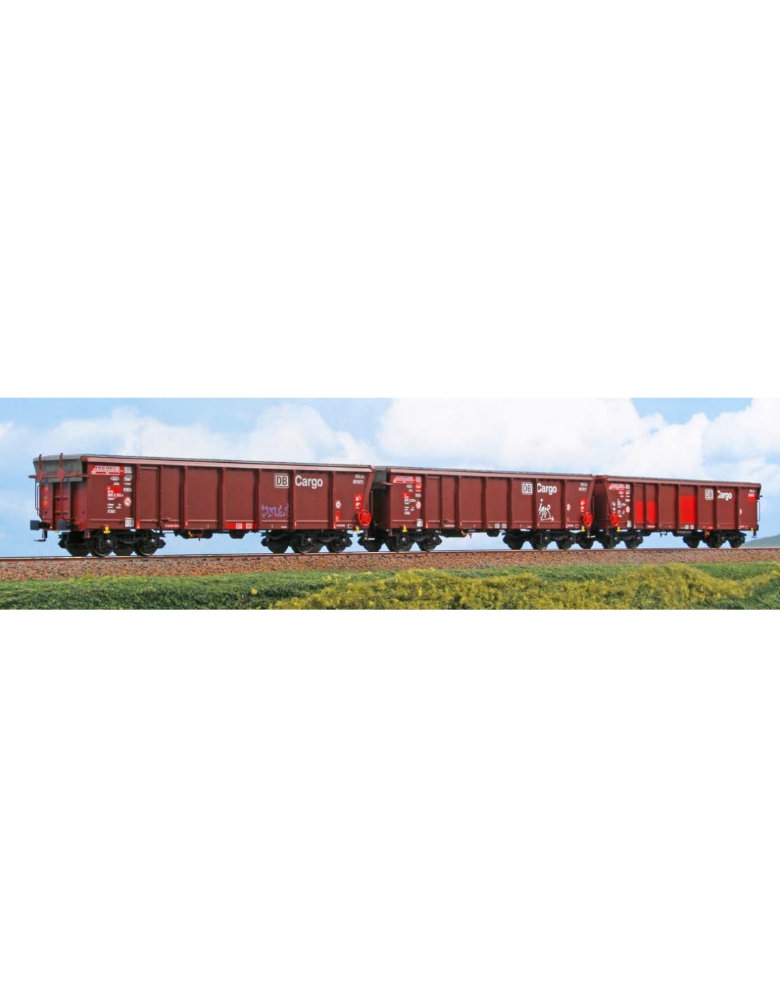 Set di tre carri Tamns895 “DB Cargo” con pezzature e graffiti, così come in servizio allo stato attuale. Tutti i carri sono decorati su entrambi i lati ed in modo differente tra di loro.