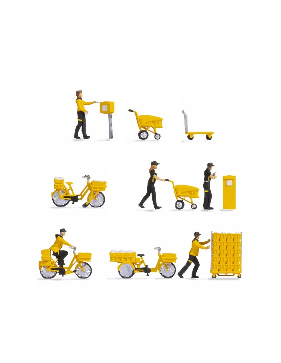 1x postino, 3x consegna pacchi, 1x postino in bicicletta, 1x auto cassetta postale, 2x carrello di consegna, 1x bicicletta, 1x bici da carico, 1x carrello di trasporto, 2x cassette postali varie