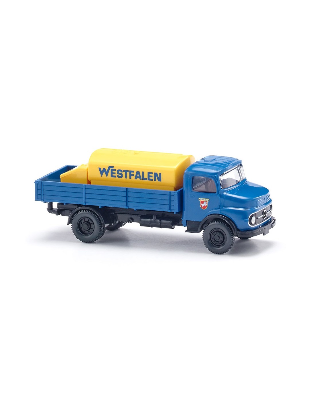 Cabina di guida con pianale in blu genziana, inserto a pianale in grigio finestra. Interno rosso marrone, telaio e ruote in nero. Parte superiore del serbatoio con copertura a cupola e anche parte inferiore del serbatoio e serbatoio montabile su veicolo in giallo colza. Griglia radiatore nera con strisce ornamentali argentate e stella Mercedes Benz in argento. Lato del serbatoio stampato con scritte Westfalen "in blu genziana, porte della cabina di guida con logo storico dell'azienda. Fari dipinti a mano."