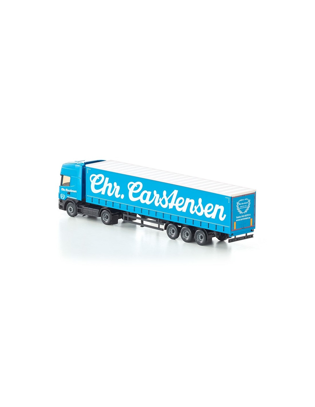 Cabina di guida dell'unità trattore azzurra con vetri in topazio chiaro. Interno con volante grigio basalto. Parte inferiore della cabina di guida e protezione laterale sotto la guida nero-grigio. Telaio con parte Cardan e scarico insieme a parafango posteriore e aletta parasole nera. Piatto della quinta ruota argento. Fari inseriti trasparenti, paraurti nero-grigio, cerchi ruota argento. Set specchi in dotazione nero. Parte anteriore della cabina di guida con griglia impressa nero-grigio e presa d'aria, con strisce bianche e scritte “Chr. Carstensen“. Tergicristalli nero, logo Scania impresso argento. Lati della cabina di guida con cornici dei vetri neri e scritte e logo aziendali. Pannelli con fari e paraurti in argento con zona azzurra e designazione del modello “R420”. Semirimorchio con telaio nero-grigio con montaggio sull'asse, gamba stabilizzatrice, protezione antincastro e cerchi ruota argento. Semirimorchio a tendina azzurro, tetto a cassone bianco. Porte posteriori azzurre. Lettering aziendale sul lato in bianco, fibbie incise impresse nero. Imprint anniversario posteriore con anno di fondazione 1892 e recapiti e sito web in bianco. Telai riflettori giallo traffico e segnali di avvertimento verticali sulla parte posteriore del semirimorchio.