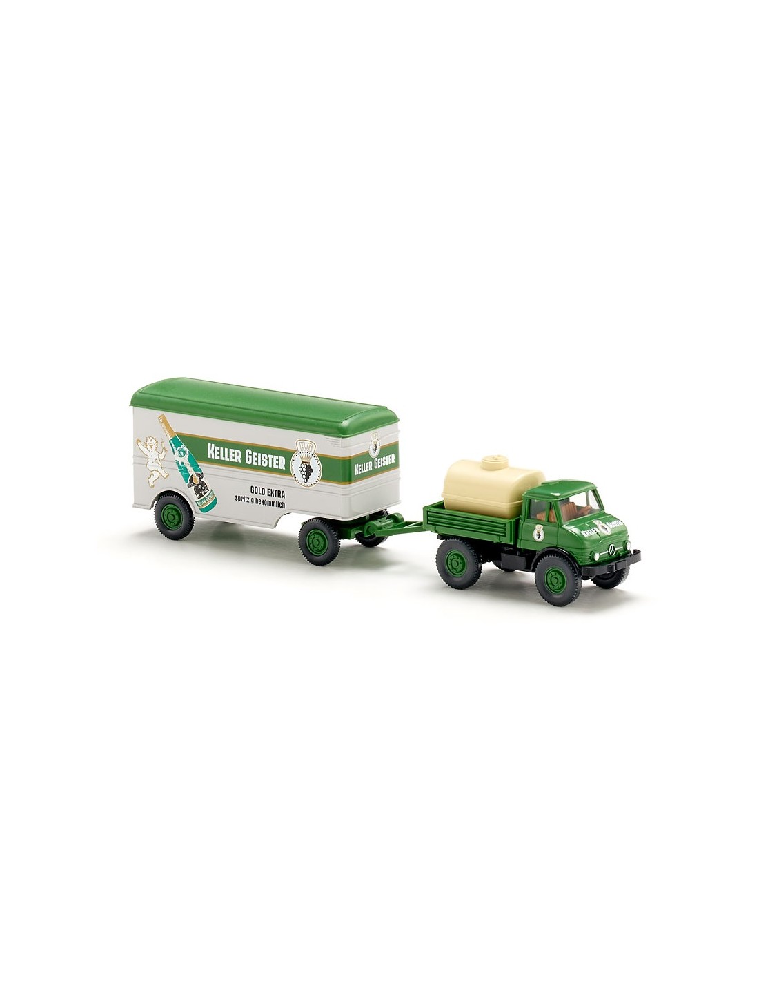 Unimog: Cabina di guida con pianale e cerchi ruota in verde erba, telaio con parte Cardan in nero. Interno con volante in ocra, argento intarsio. Proiettori dipinti a mano. Stella Mercedes-Benz e striscia ornamentale su griglia verniciata argento. Logo Keller Geister "sul lato impresso bianco, oro e nero. Cappuccio con scritte "Keller Geister", impronta tricolore del logo al centro delle scritte. Rimorchio box con sovrastruttura grigio chiaro e parte del tetto verde erba, porte posteriori anch'esse grigio chiaro. Telaio con timone e cerchi ruota verde erba. Rimorchio a scatola con linea dorata che corre in alto e in basso attorno alla parte anteriore e ai lati. Cintura centrale impressa verde. Rimorchio anteriore della scatola con impresso la scritta "Keller Geister" e il logo multicolore. L'impronta laterale include anche la scritta "Keller Geister" e il logo con l'immagine del prodotto contemporaneo."