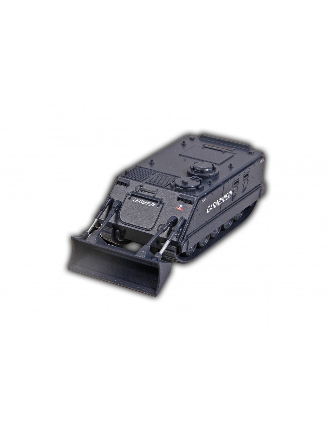 Carro armato M113 dell’Arma dei Carabinieri, in configurazione “tutela ordine pubblico” con lama anteriore per la rimozione degli ostacoli, livrea blu.